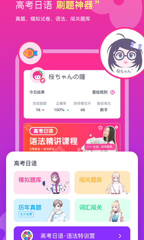 想要轻松的学会日语是很简单的事情的,只要下载了樱花斩就可以轻松的掌握日语了。樱花斩是一款很不错的日语学习软件,这个软件提供了从入门到专业的学习资料,满足用户不同学习阶段的需求。而且用户还可以在这里用不同的方式进行学习,让用户听读写都可以全面提高,轻松掌握日语。并且还有大量的题库可以练习,帮助用户可以巩固自己的知识。